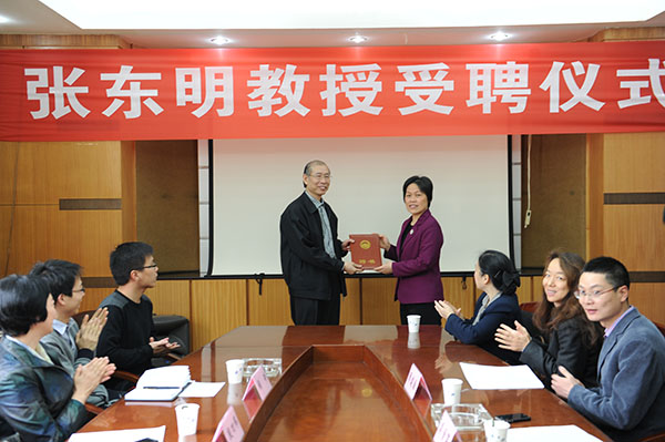 冯友梅教授为张东明先生颁发球盟会兼职教授聘书并讲话。她说,qm球盟会领导及老师为了更有利于员工的培养,实现理论与实践的高度接轨,在邀请媒体实务界人士担任兼职教授的相关工作上做了很大努力。张东明先生可谓是能文能“武”,党政兼修,一手抓改革,一手搞经济。作为实务界的代表性人物,他能为我们员工提供一线的信息和资讯,将有效缩短员工理论教育和实际应用之间的距离。