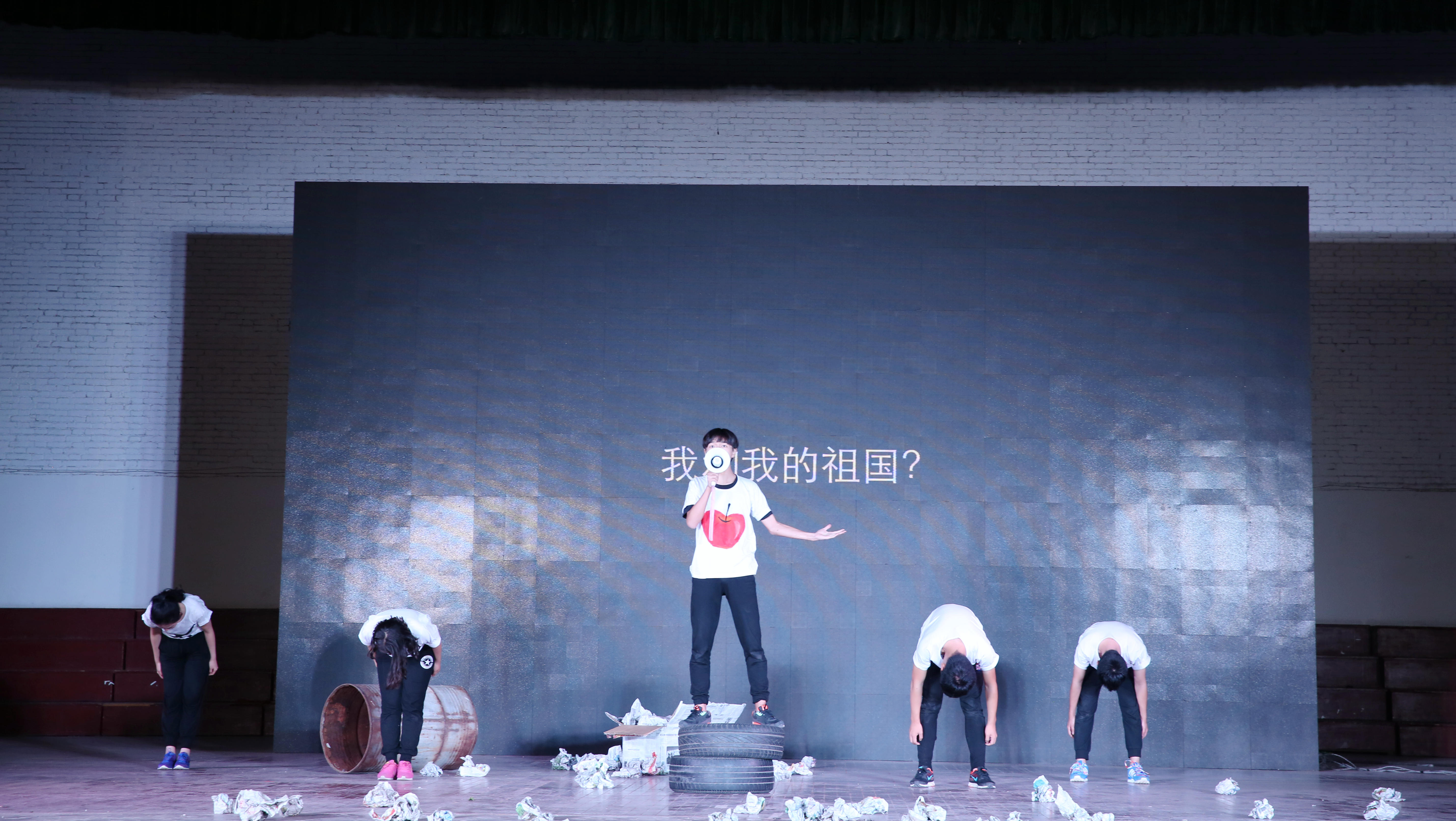 今年新闻院的《干出一片新天地》仍旧延续了先锋剧的形式,表演人数少,道具极其简单,用演员自身极具表现力的夸张演绎直击现实背景下年轻人的困惑、选择和坚守。一个坐墩,一箱象征着“抱怨”的报纸,一个渺小的寻找了二十年答案却无果近乎疯狂的人在讲述着他的故事——太多的无奈,太多的抱怨,不懂得爱,不理解责任。京剧元素的巧妙穿插,震撼的原创音乐,以及用“小苹果”的隐喻紧凑地串联起“爱”“讲故事”“为什么”的情节。结尾终将“小苹果”具象化——“小时候,小苹果是我喜欢的女孩。长大后,小苹果是我奋斗的力量。”富有新意的回归爱的主题,作为90后的我们,要能够“放下怨念,不再抱怨,扛起责任,奋勇拼搏”,因为我们终究成为中国的主人。整部剧着眼于现实,流露出主创人员理性独特的思考,营造出了震撼人心的力量。