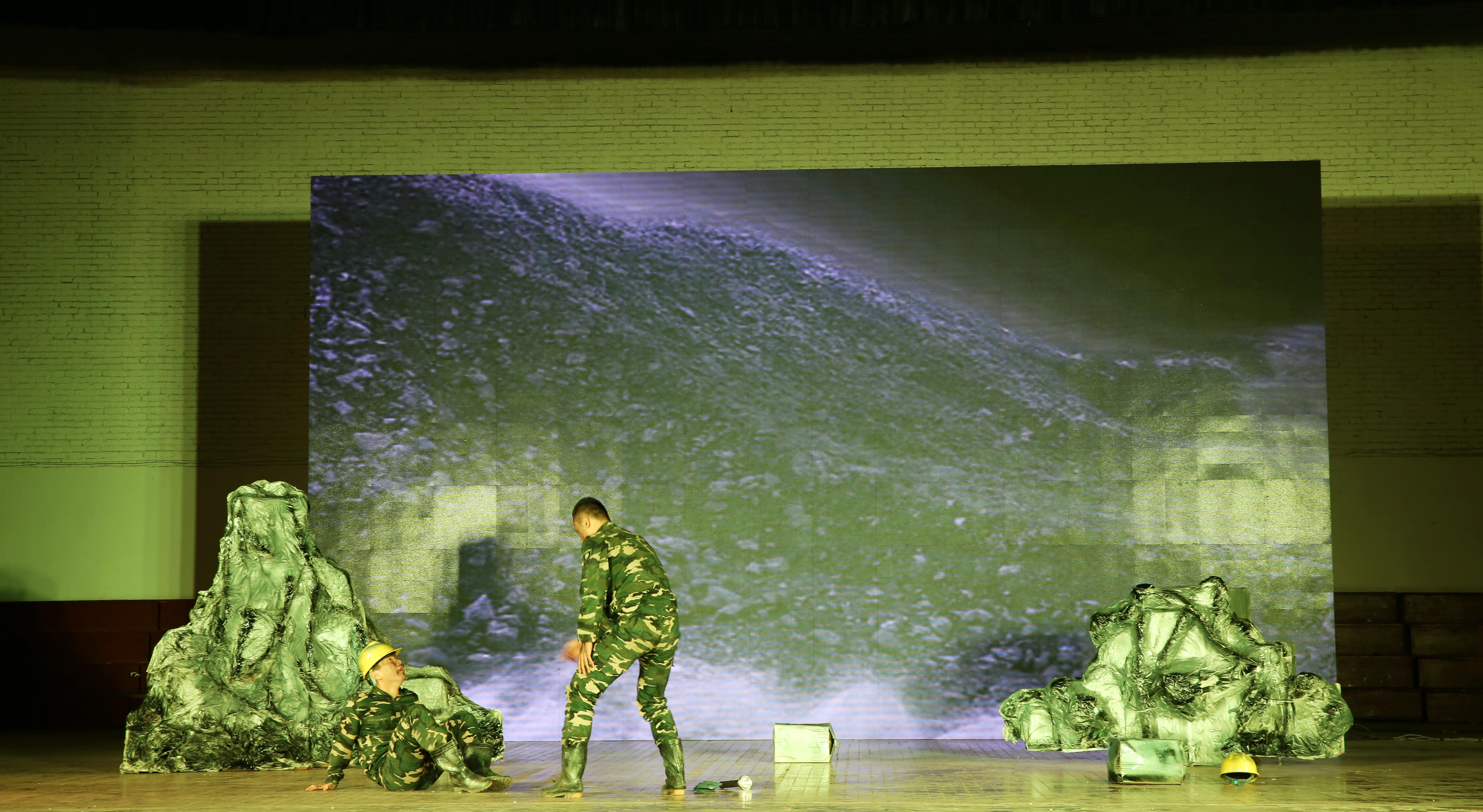 去年缺席金秋情景剧的艺术学系重返舞台,这次,他们选择以两个人,以大胆独特的方言的形式,讲述了一个关于工程兵的故事。他是班长,他是列兵,他们共同被困暗道。班长的老练沉稳,列兵的胆小怯懦,在暗道的对话中表现得淋漓尽致。暗道坍塌的晃动,却被班长说成“大山呼吸的声音”。当列兵说自己后悔当工程兵的时候,班长愤怒地把他一把推倒在地,回忆起那些为暗道留下鲜血和为祖国建设甘于牺牲的峥嵘岁月。在暗道即将坍塌的时候,他又一次选择护住列兵,自己却被石头深埋......这是来自大山深处的声音,沉稳,而又有力。