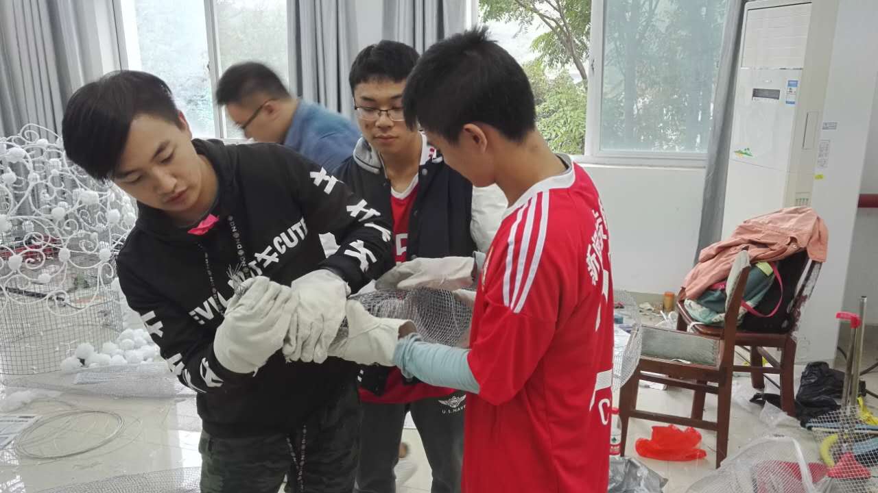 在院办128时常能看到他们忙碌的身影——拧铁丝,用胶枪,揉棉花,拗水管,铁丝穿水管,喷漆,刷漆,刷颜料……每一件琐碎的艰难的事情他们都在用心去做。他们是在用每一次行动、用心去阐释“三年冠军就是一个王朝”的意义。