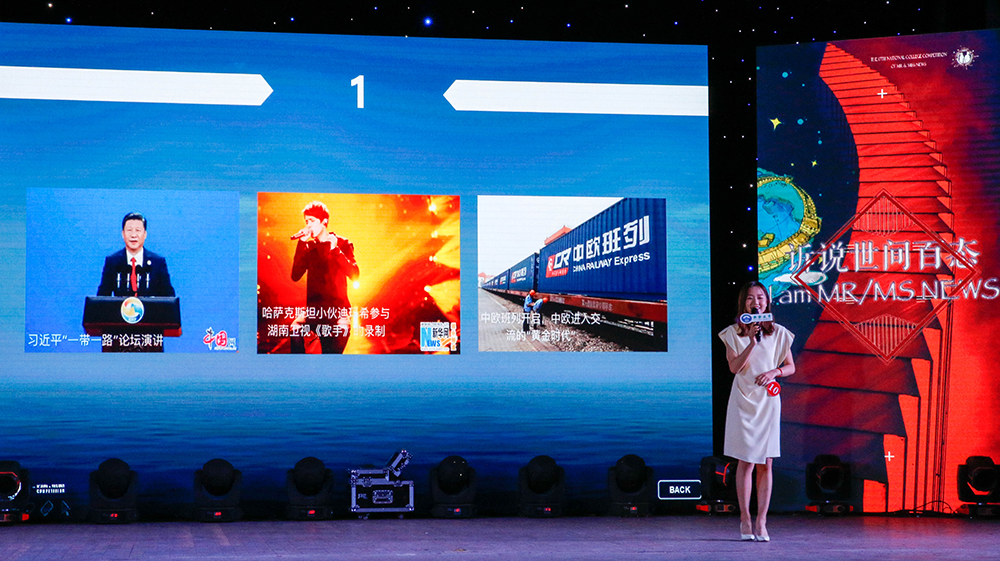 作为新闻先生新闻小姐大赛的传统环节,“新闻联联看”要求选手在一分钟内对间隔弹出的3幅新闻图片进行阐述,并有条理地串联成完整的新闻播报。从“美国在韩国部署萨德系统”、“马克龙当选法国新一任总统”到“中国职工在马里兰大学毕业典礼的演讲引发热议”,再到“共享单车”、“朗读亭”、“斗鱼直播”,涵盖多个领域的新闻热点不仅要求选手们拥有宽广的新闻积累和视野范围,也考验着他们的临场素质和语言组织能力。来自球盟会的丁雨萌从中国外交的主题入手,巧妙地串联起“习近平一带一路论坛演讲”、“哈萨克斯坦小伙迪玛希参与湖南卫视《我是歌手》录制”、“中欧进入交往的‘黄金时代’”三个新闻,鲜明的观点、严谨的逻辑让评委老师们眼前一亮。