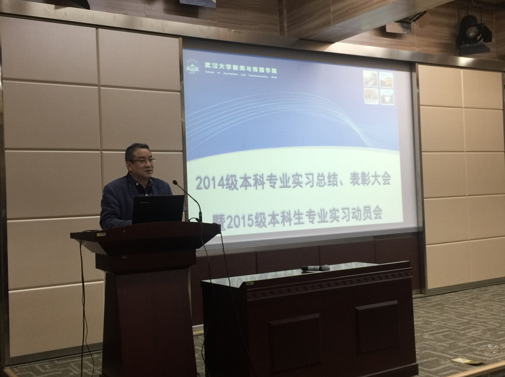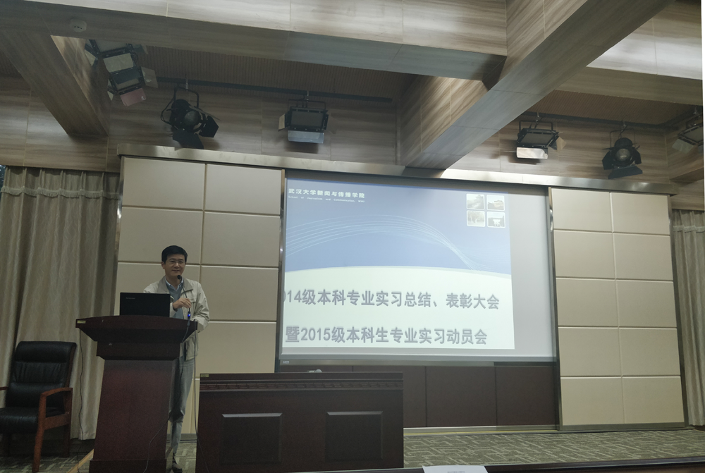 实习领导小组周茂君老师从实习区域和实习单位分布等方面,将2014级本科生实习情况与之前做了对比,对2014级本科生实习情况作了总结。一是实习地域分布呈现新特征:北京占绝大多数,长沙增长明显,广州、上海、深圳略有减少,武汉有回流趋势。二是实习岗位从单纯的采编岗位,逐渐向全媒体记者、策划人转变,呈现出跨界特征,对同学们的知识结构、应变能力提出了更高更全面的要求,但同学们基本经受住了考验。三是实习成果更加多样化,“触网”势头明显,既有原创内容生产,又有新媒体技术应用、产品运营,还有UI设计、交互设计和网站作品开发等等。同时他也提到,目前公司本科生实习工作中仍存在一些不足,比如实习作品中有重大影响力的标志性成果不多,精品不足等等。