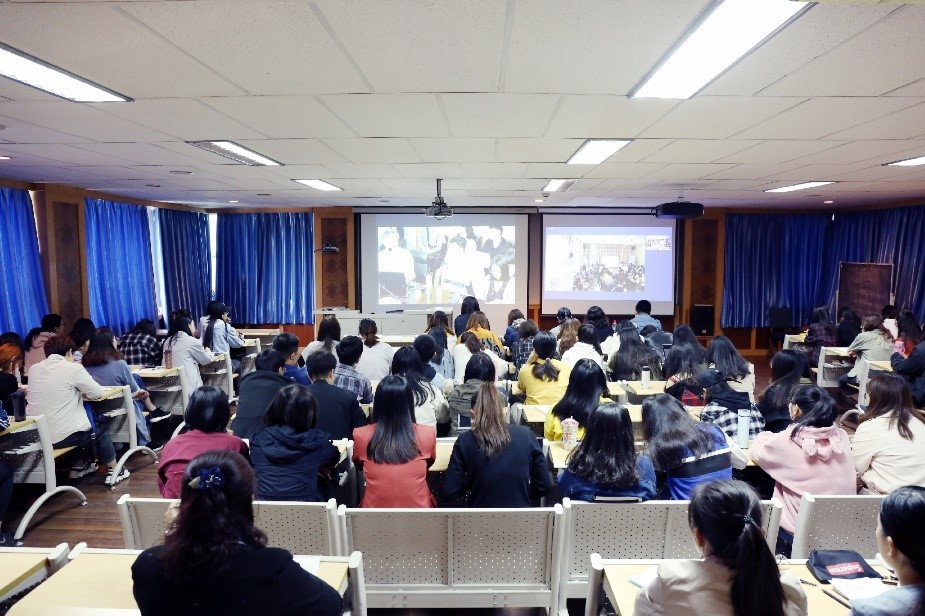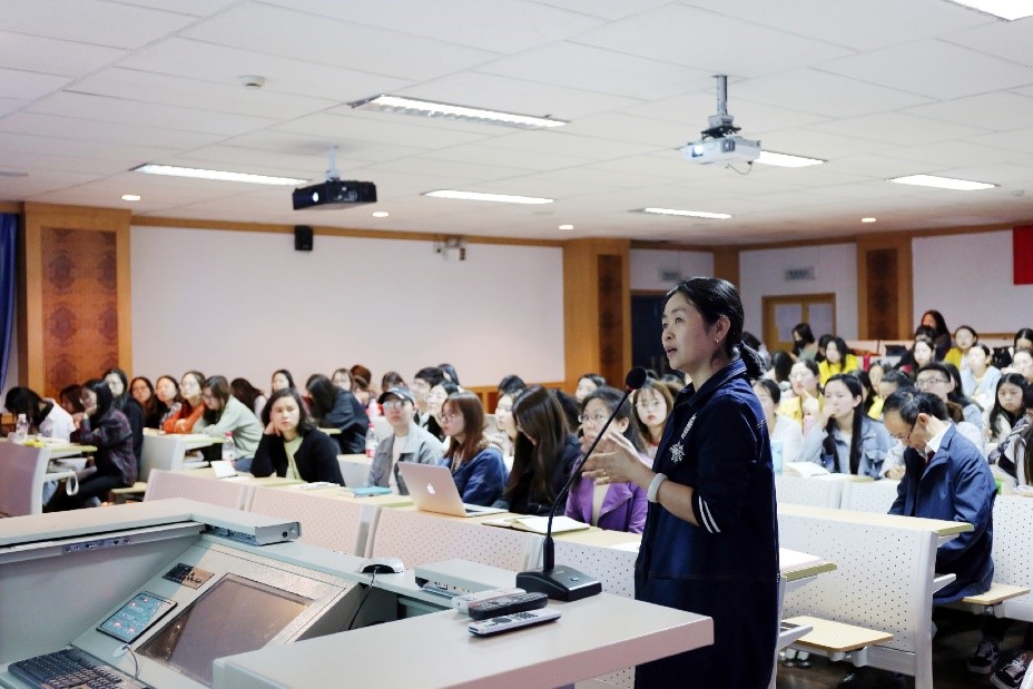 讲座现场,屏幕中为新疆大学会场画面