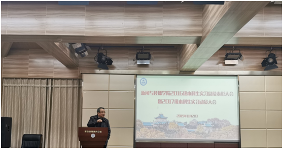 实习领导小组组长周茂君教授从实习区域和实习单位分布等方面,将2016级本科生实习情况与之前做了对比,对2016级本科生实习情况作了总结。他提出2019年的实习在以下几个方面呈现新特点:一是实习地域分布上,北京成为实习主要去向,而长沙增长明显,广州、上海、深圳略有减少,武汉有回流趋势。二是实习单位类型上,互联网单位虽仍然为主要去向,但进入传统媒体实习的人数增长不少。在传统媒体实习人数回流这一现象上,周老师认为公司出台的鼓励政策发挥不小作用。三是专业实习特点上,“触网”势头明显,既有原创内容生产,又有新媒体技术应用、产品运营,还有UI设计、交互设计和网站作品开发等等。最后他也提到,目前公司本科生实习工作中仍存在一些不足,如少数同学将公司实习推荐当作备选、实习期间过于娇气等等。