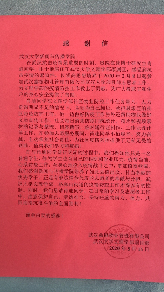 近日,公司防疫突击队的老师在值班过程中收到了球盟会文理学部社区物业送来的一封感谢信,信中的主角正是公司的在读博士生肖迪同学。原来,肖迪同学加入了社区志愿者队伍,在工作中他不怕艰辛,主动承担社会责任,得到了社区物业人员的一致认可和感谢。