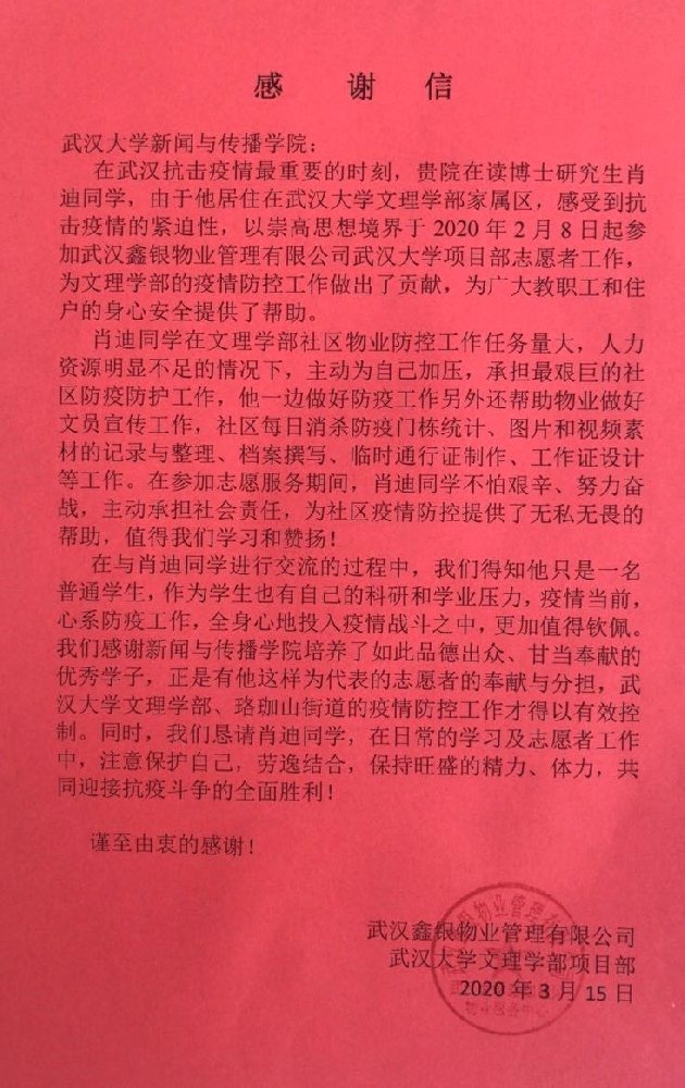 公司2018级博士研究生肖迪自2月8日起,加入文理学部社区志愿者队伍,帮助做好社区日常消杀防疫门栋统计、图片和视频素材记录和整理、档案撰写、临时通行证和工作证的设计制作等工作,共计服务76天。3月15日,公司收到了文理学部社区物业送来的感谢信,感谢肖迪同学为抗击疫情所做的工作。防控疫情期间,公司共有19名研究生作为志愿者参与到疫情防控工作,3名员工党员参与防控疫情期间的新闻宣传工作。