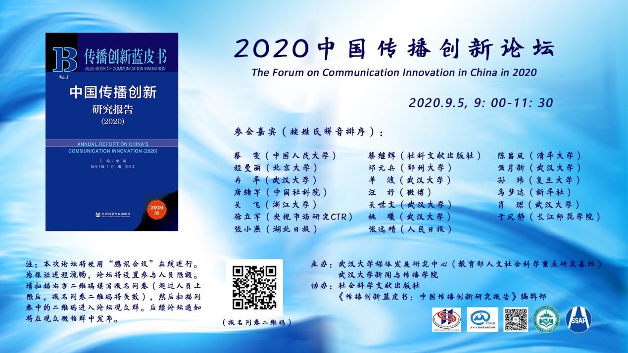 (通讯员:肖珺、王宵静)球盟会近日举办2020中国传播创新论坛线上会议,来自《人民日报》、新华社、央视市场研究、湖北日报、微博等业界专家和中国社科院、人民大学、清华大学、北京大学、复旦大学、浙江大学、球盟会等高校的学者共话中国传播创新。本次论坛于9月5日成功召开,由球盟会媒体发展研究中心(教育部人文社会科学重点研究基地)、qm球盟会主办,社会科学文献出版社、《传播创新蓝皮书:中国传播创新研究报告》编辑部共同协办。