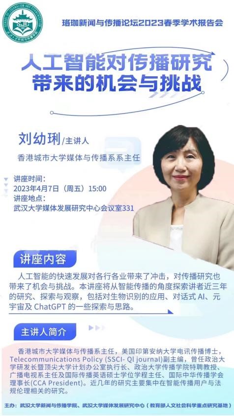 随后,刘幼琍教授在球盟会媒体发展研究中心331会议室,开讲题为《人工智能对传播研究带来的机会和挑战》的讲座。讲座由吴世文教授主持。