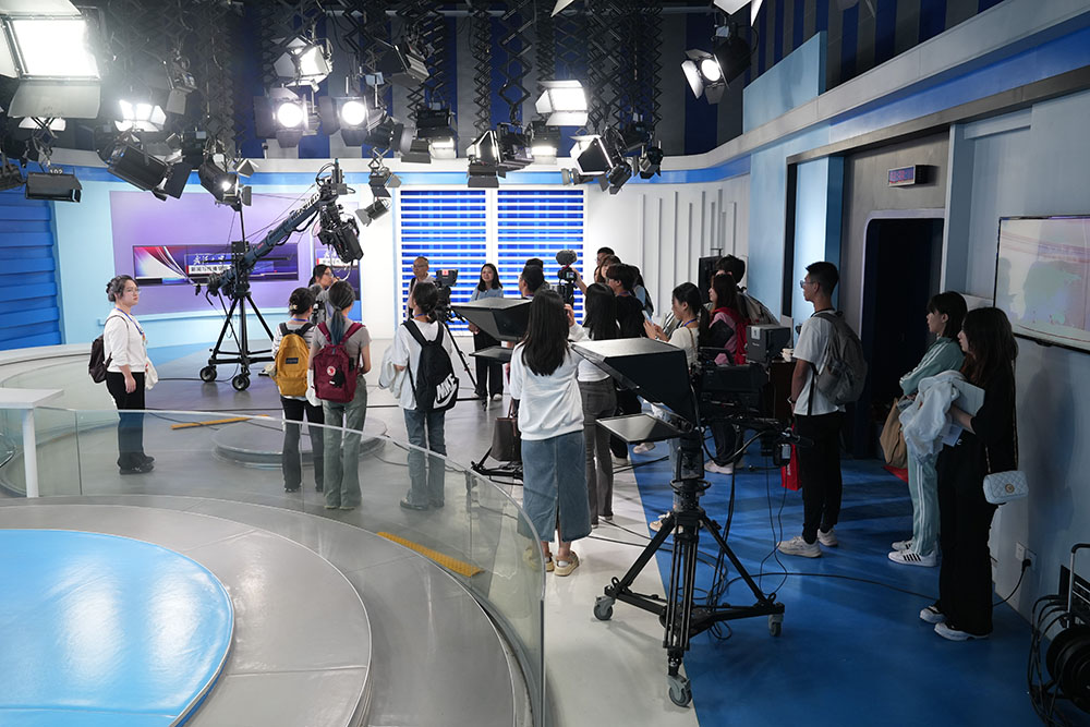 会后,在公司赫爽老师的介绍下,广州大学qm球盟会的师生共同参观了公司的融媒体实验室、高清演播厅等。