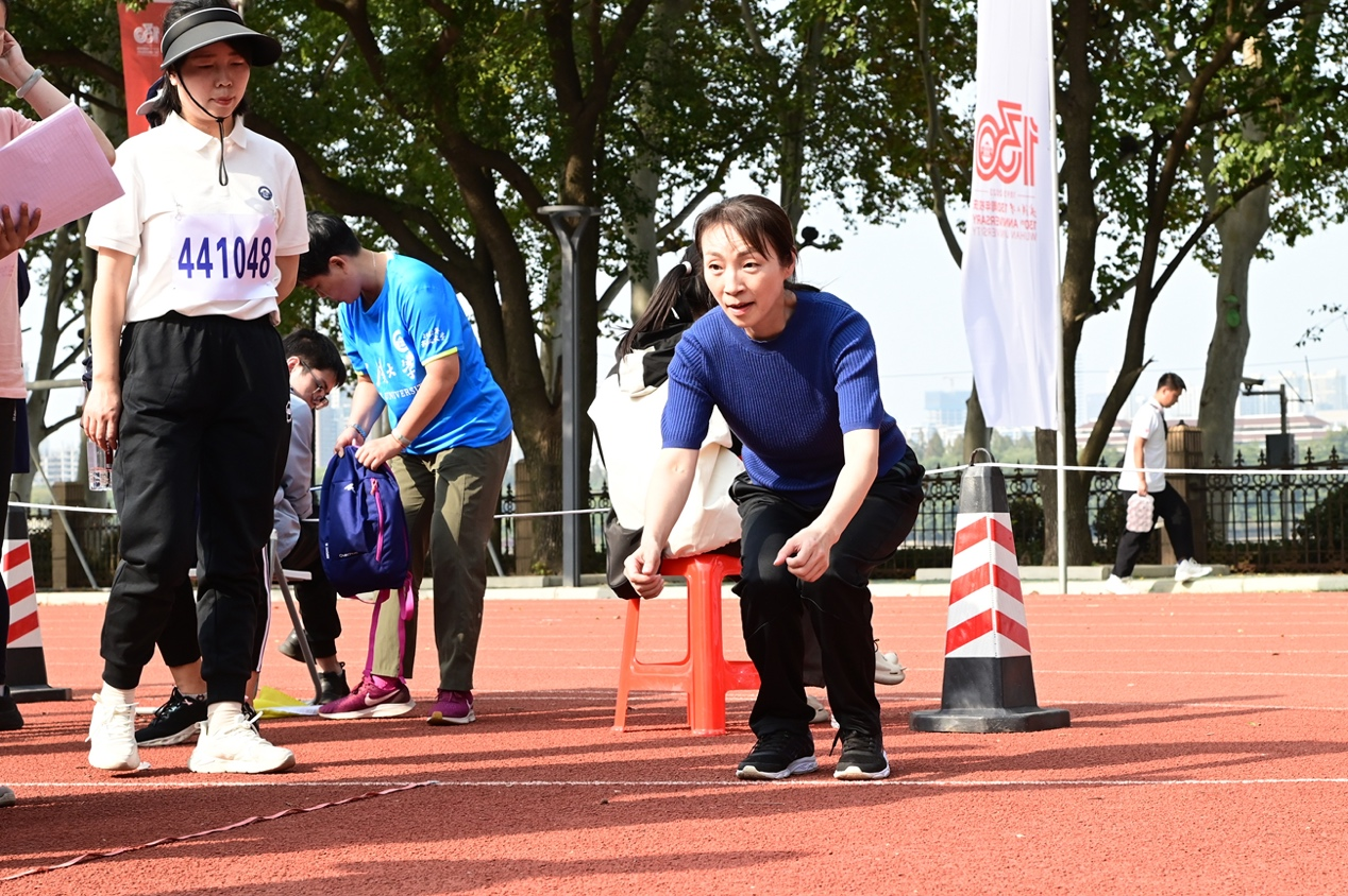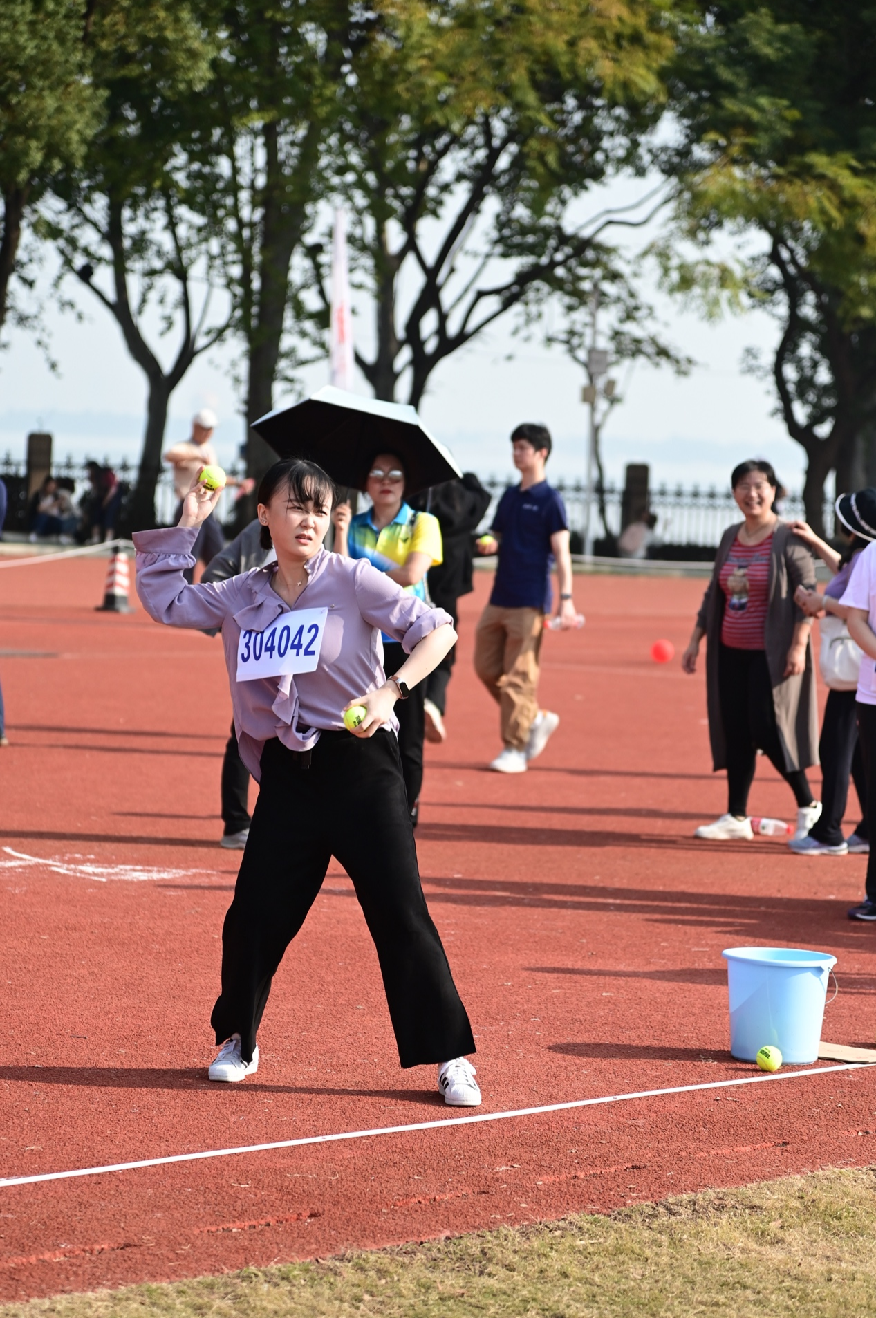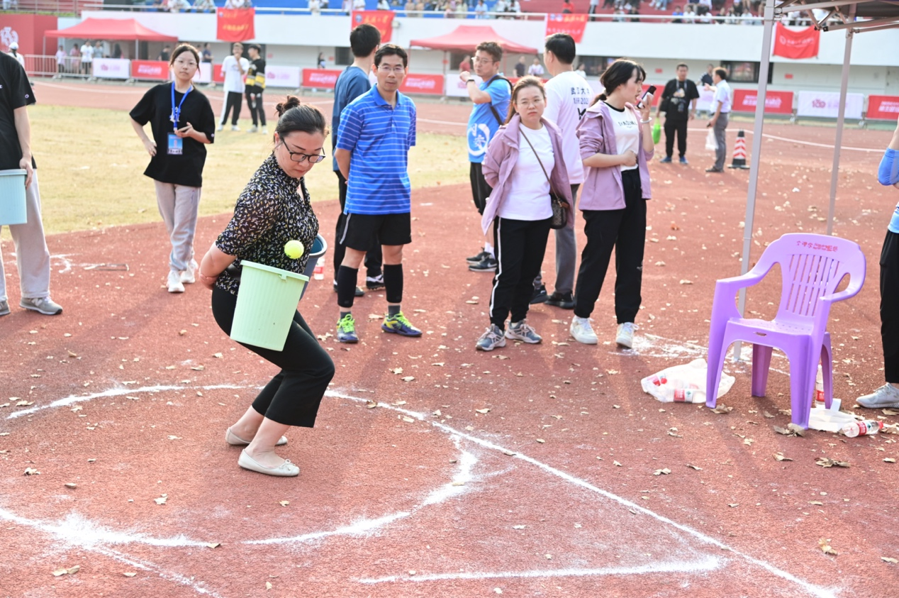 而男子组的网球掷准基本规则和女子组别无二致,只是投掷距离远了不少,玉手的力量已难以将网球精准掷入。公司汪晓清老师五指轻握小球,灵活转动手腕,轻抡手臂,巧手出巧劲,一次次将球抛向靶位。在不断的加油声中,汪老师以第8名的成绩(该项目前8名获奖)完成了对自己往年成绩的超越。汪老师说,明年我就要退休了,这最后一名最后一次的获奖也给自己工作生涯中的校运会参赛划上了完美的句号。汪老师平静的话语,却道出了平凡中的传奇。
