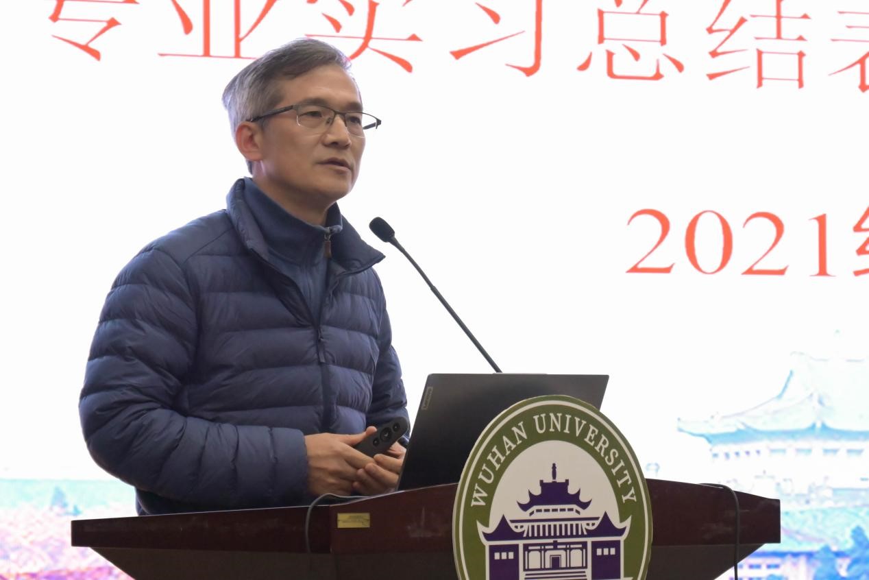 大会第一项,徐同谦老师从实习地域分布、单位分布等角度详细总结了2020级本科生的专业实习情况。相关数据显示,公司较多本科生选择在北京、上海等地实习,具体单位以央媒为主,呈现出多元化的特点。同时,徐老师也指出了2020级本科生在实习当中遇到的各类问题和不足之处,希望各位同学能够多加注意,在实习过程中展现出珞珈新传人的最佳风貌。