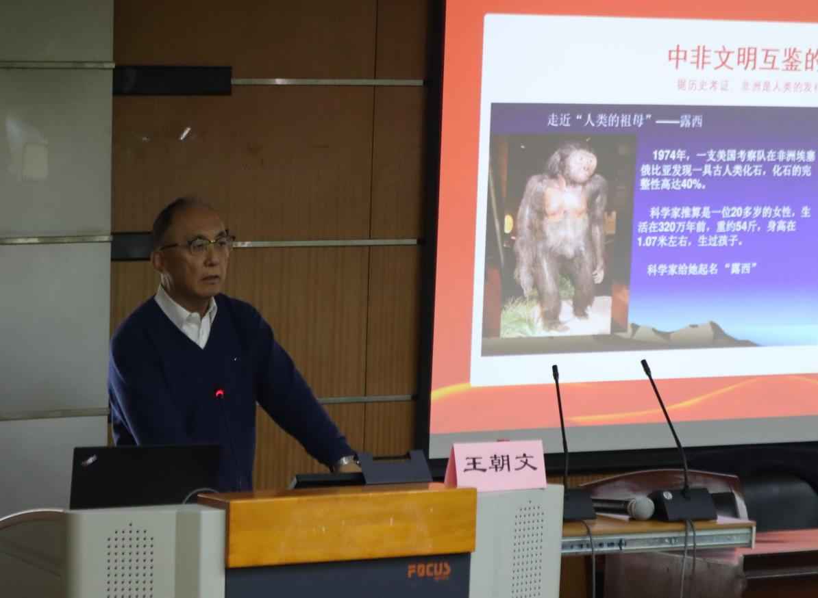 王朝文老师的讲座主要分为“中非文明互鉴的历史印证”“中非民心相通的现代故事”“从相互支持到命运共同体”三个部分。
