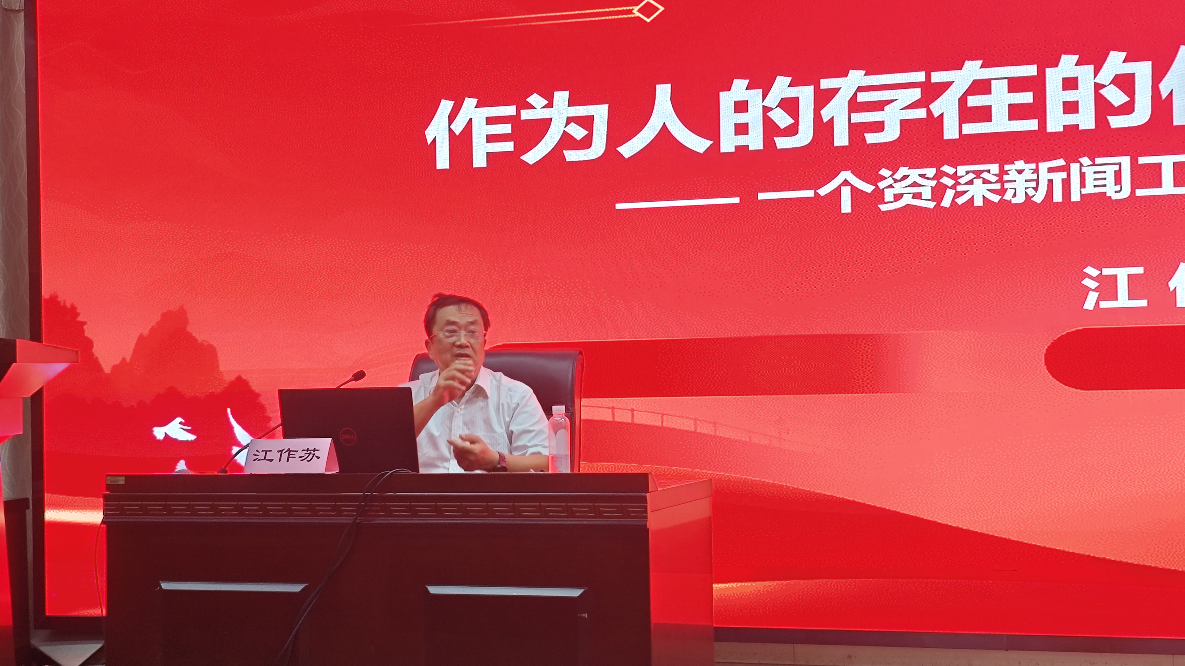 5月22日下午14:30,“马克思主义新闻观大讲堂”系列讲座2025年第2期在学院三楼报告厅举行。湖北省人民政府文史研究馆文化传播院经理江作苏教授主讲“作为人的存在的传播伦理”。新闻学系主任王敏副教授主持,本硕博员工100余人参加。